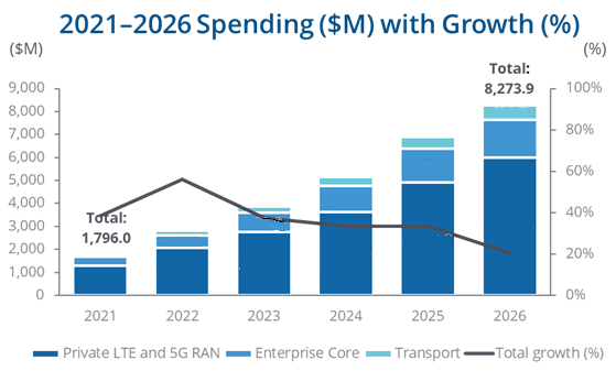 IDC 咨询公司预计到 2021-2026 年全球 LTE 和 5G 企业专网基础设施的市场空间将保持 35.7% 的复合增长率,预计到 2026 年整体市场空间可达 82 亿美元。