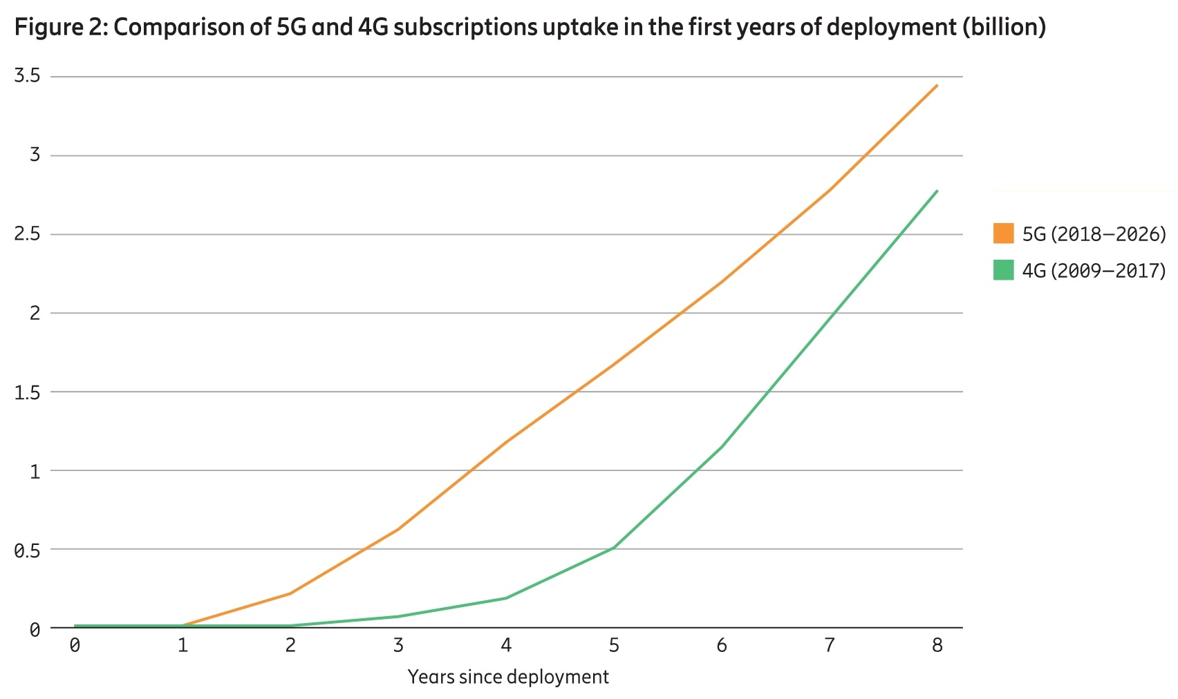 对比而言,4G 早期的用户增长是比较慢的,5G 的用户增长则会快很多。