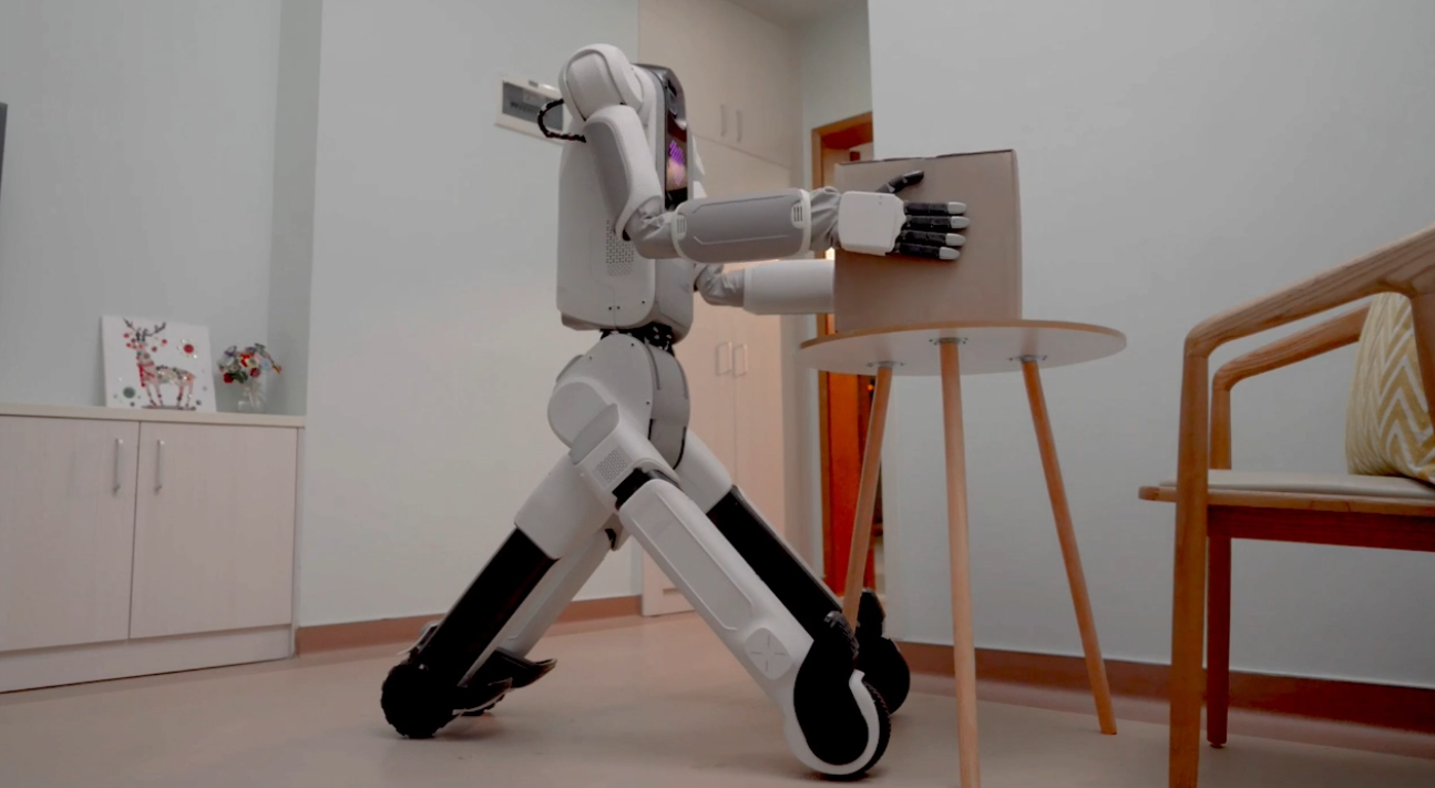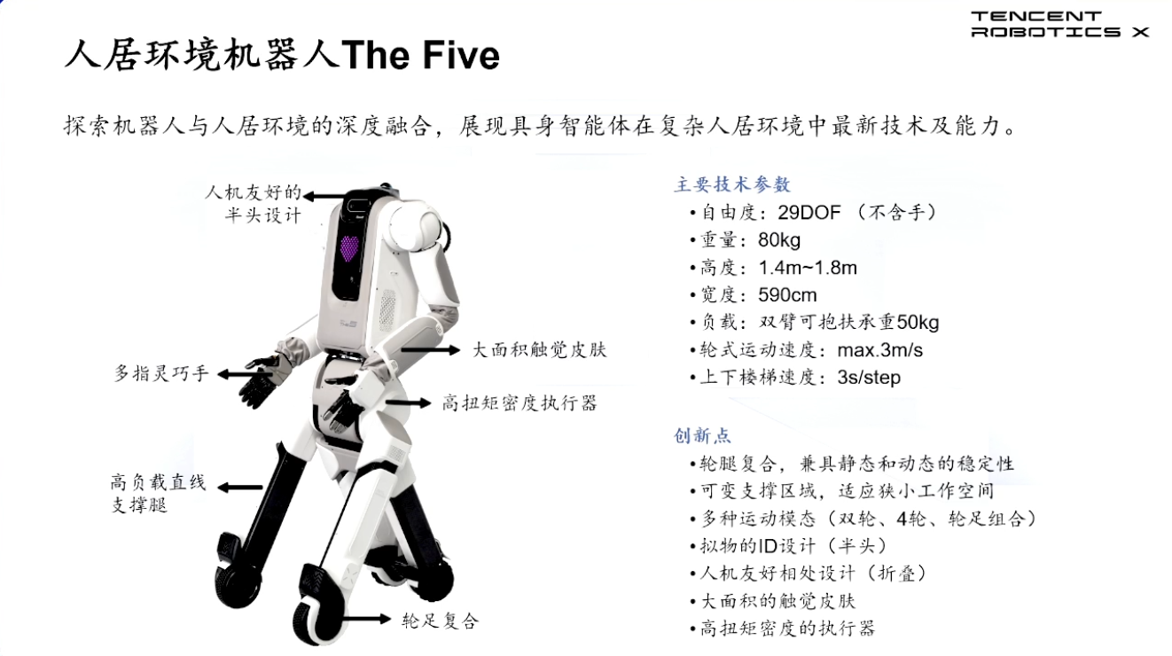 附图是腾讯提出的人居环境机器人 The Five,展示了其作为家庭成员完成通用任务。