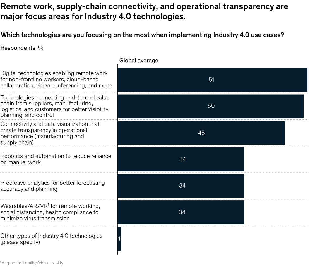 根据 Mckinsey 的研究(2020年疫情爆发后),企业看中的工业 4.0 用例落地技术,前几名是: