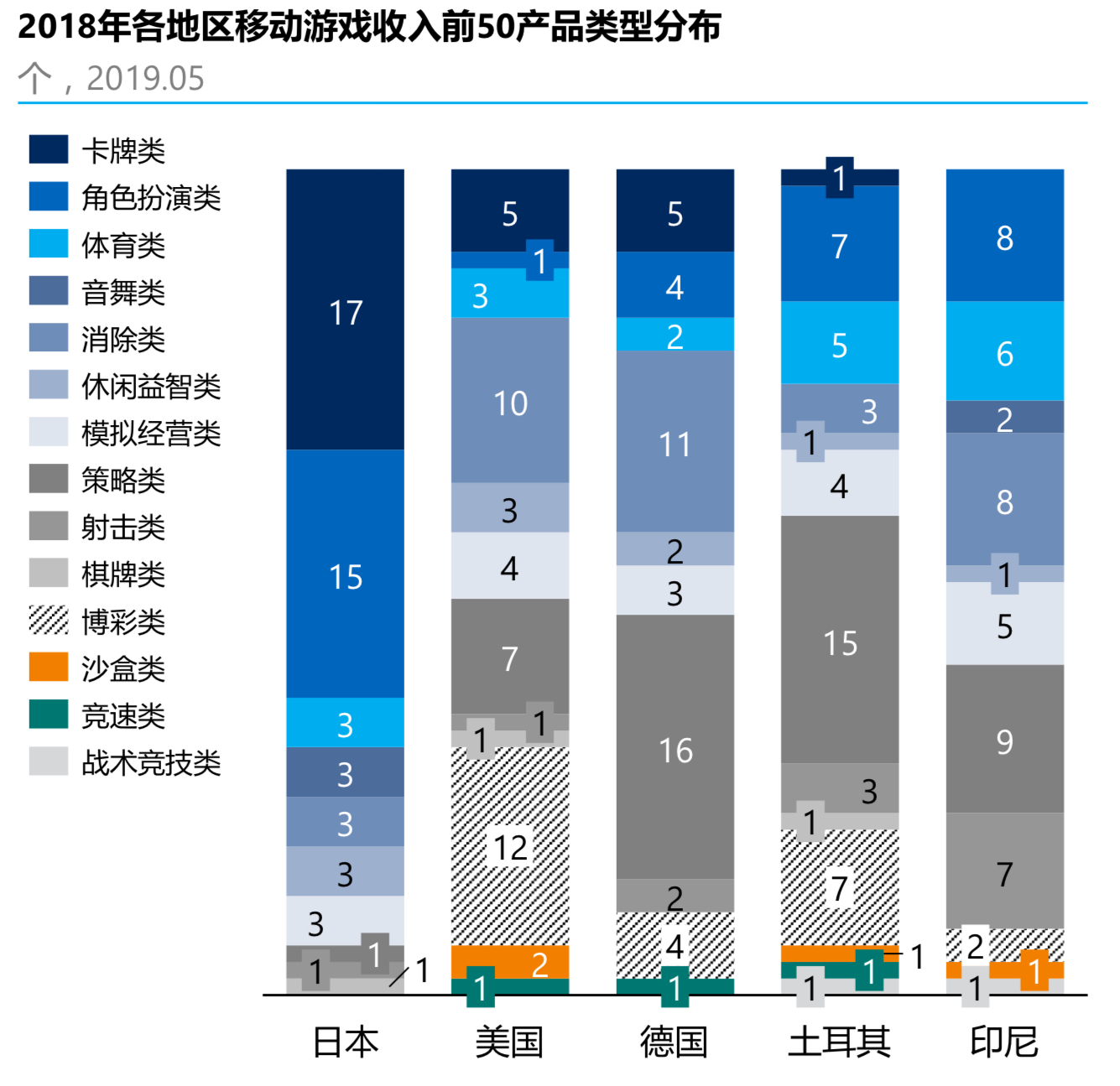 九谦咨询对日本、美国、德国、土耳其和印尼五个国家 Top 50 移动(手机)游戏进行了归类整理。