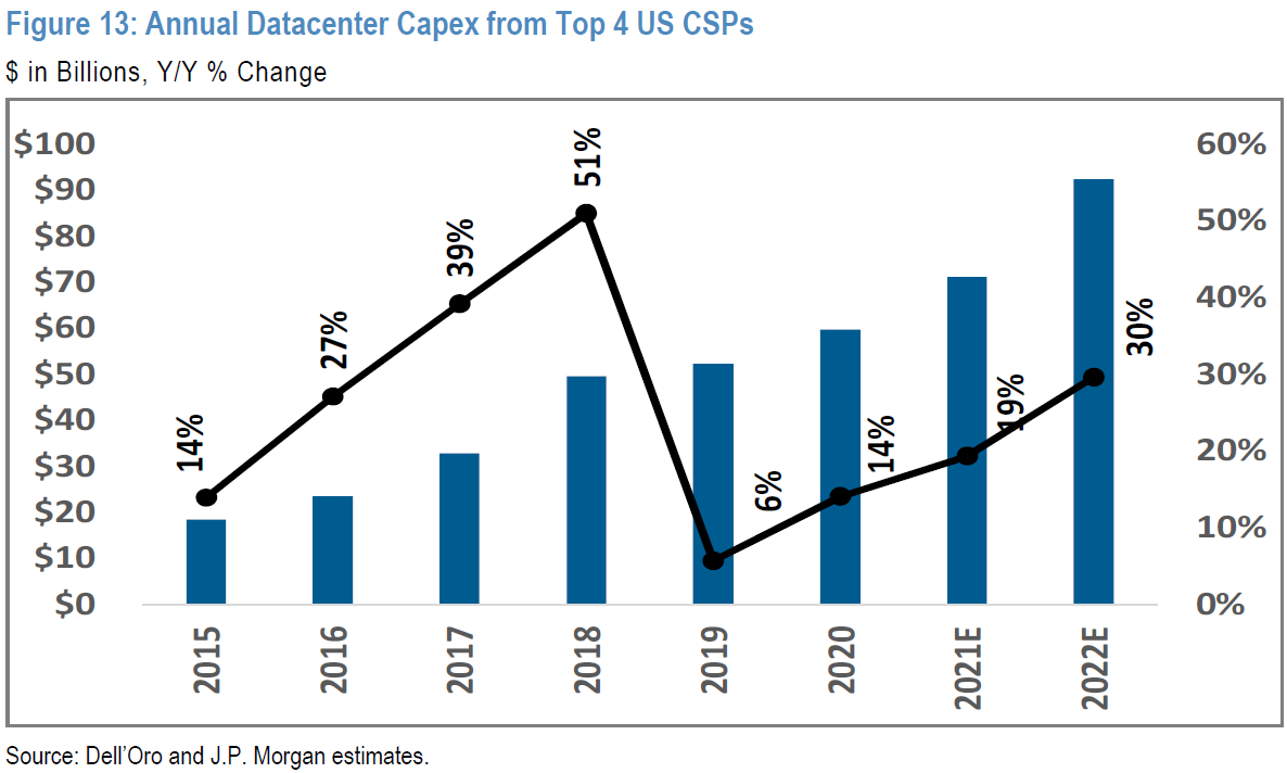 虽然前几年美国运营商在不断剥离数据中心,以期望更轻资产的方式来运营。但从 J.P. Morgan 的研究看,情况可能不是简单的减法。
