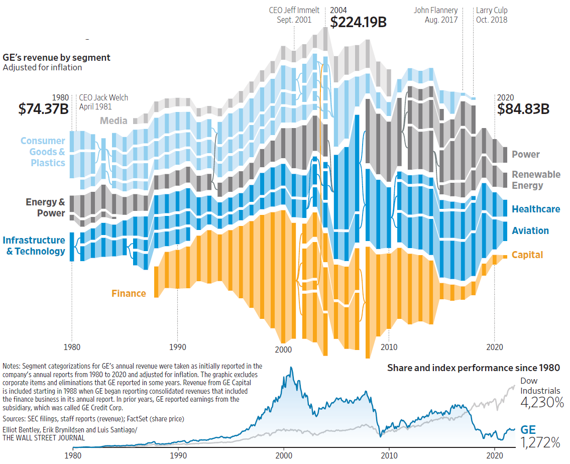 WSJ 绘制了 1980 ~ 2020 四十年 GE 的收入构成和股价变化。