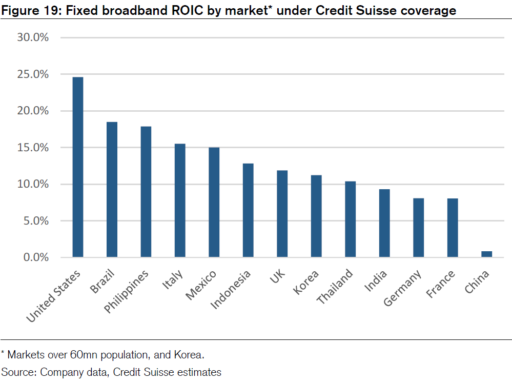中国的情况比较特殊,93% 以上的光纤到户渗透率,相当低的 ARPU,回报率自然就不够理想。