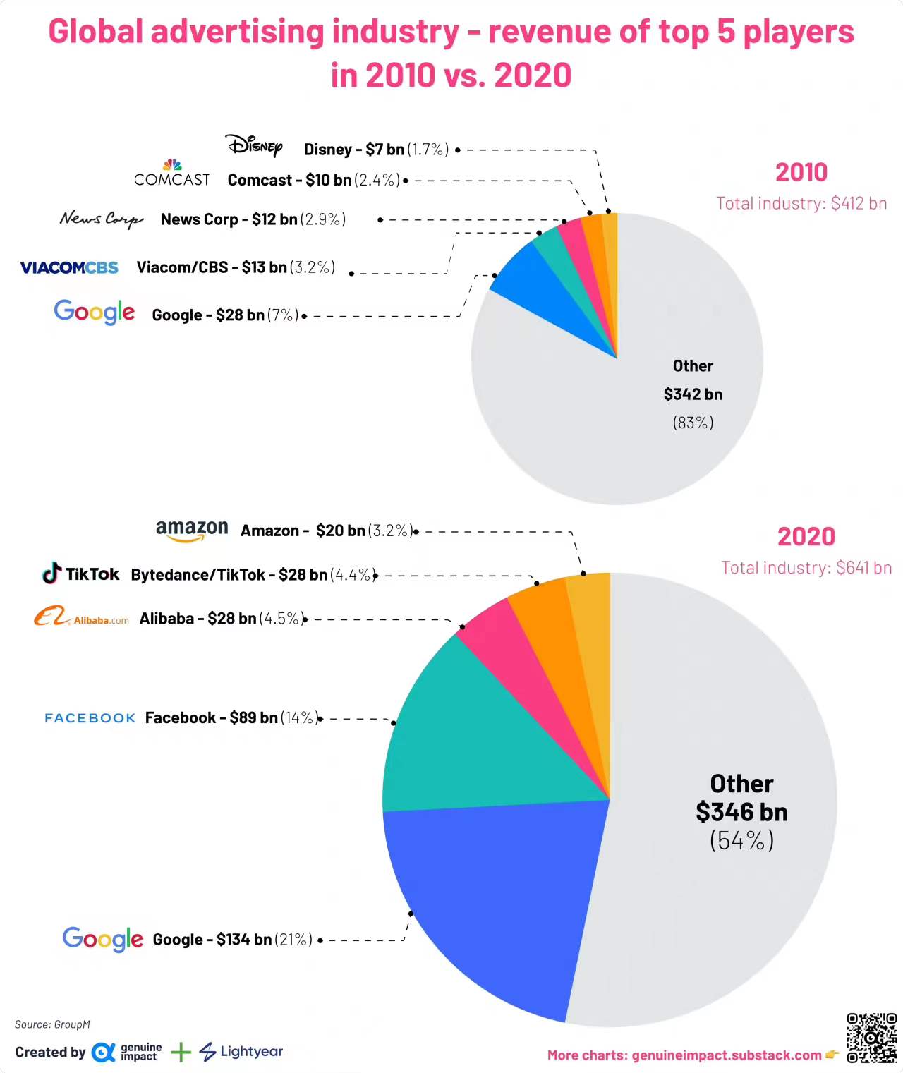 根据群邑媒介集团(GroupM)的数据,2010 年全球广告产业收入体量为 4120 美元,2020 年这一数字上升到 6410 亿美元。