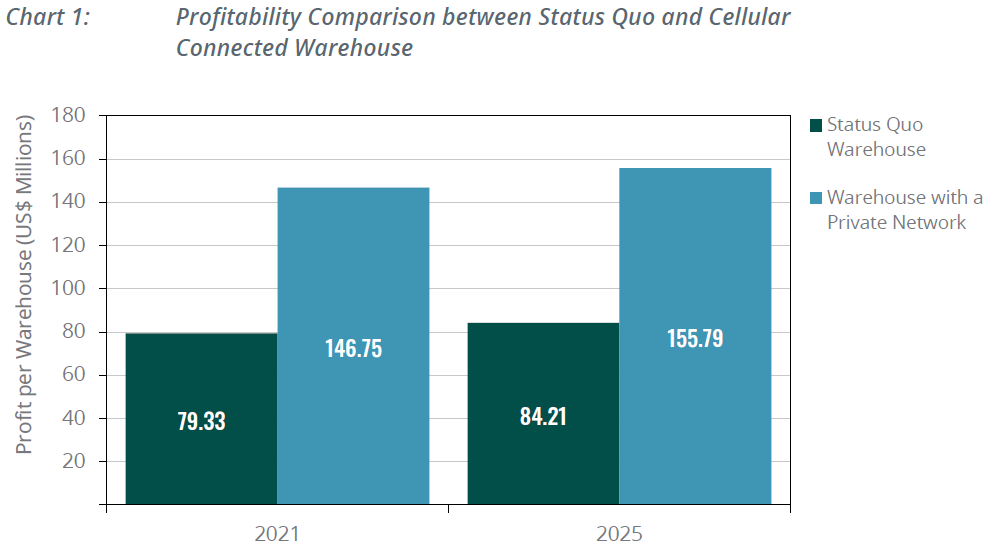 ABI Research 的一项研究换了一个思路,其从仓储服务提供方角度,估算了普通仓储和配套了 5G 专网的仓储的出租价格。