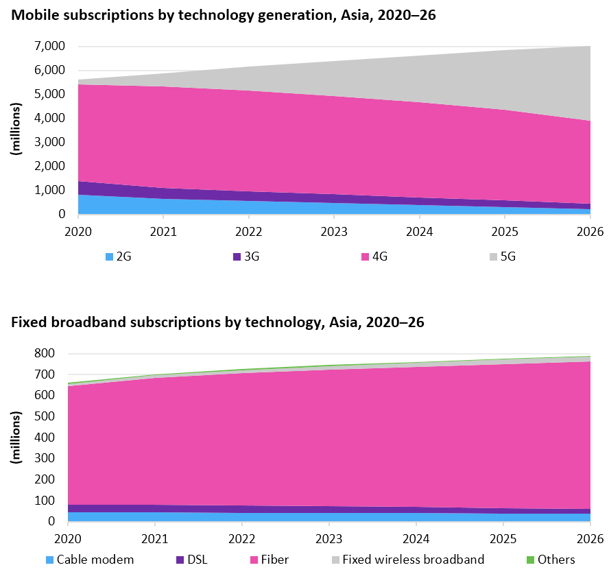 预计 2026 年,亚洲移动业务连接数为 70 亿,固定宽带为 接近 8 亿,两者大约为 8.75 : 1。