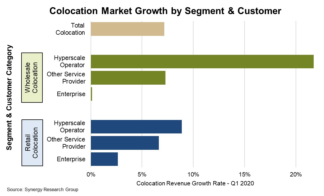 根据 Synergy Research 的数据,2020Q1 全球主机托管收入达到 95 亿美金,同比增加 7%。从客户需求来看,来自 Hyperscale operators (包括:IaaS, PaaS, SaaS, 搜索引擎、社交网络和电子商务)的采购需求增长更为迅猛,增长率达到 22%。