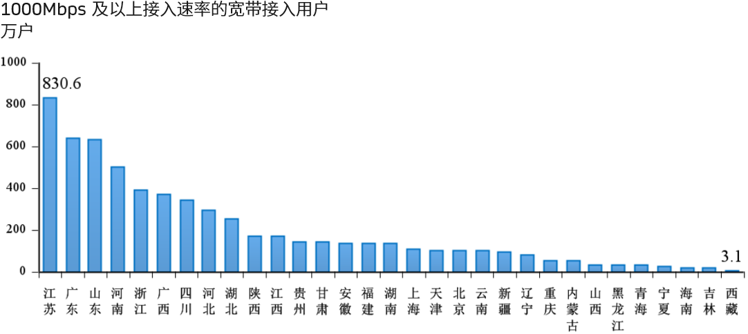 1Gbps 及以上速率的比例为 8%,还处于较小的份额。未来几年,行业最大的变化趋势就是超千兆宽带的发展。