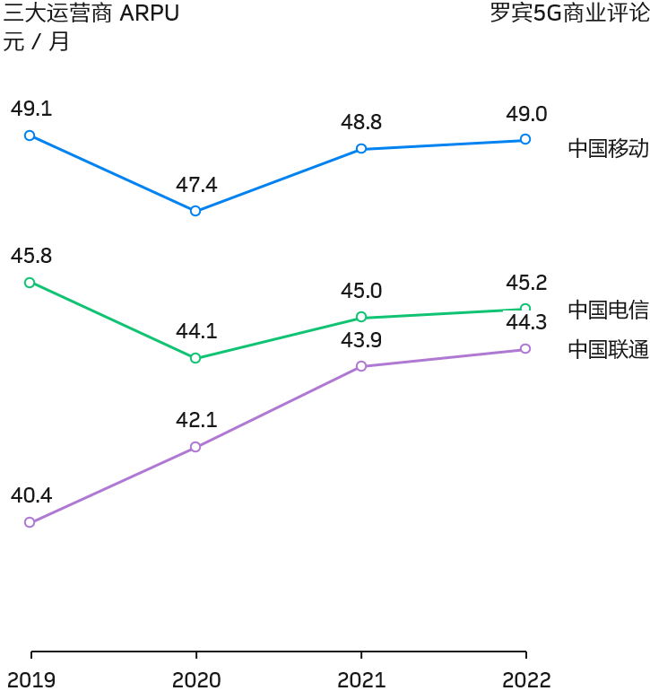 最新数据显示,三大运营商的 ARPU 取得了持续的提升。中国移动和中国电信也接近恢复到 2019 的 ARPU 状态。中国联通则连续四年往上走。
