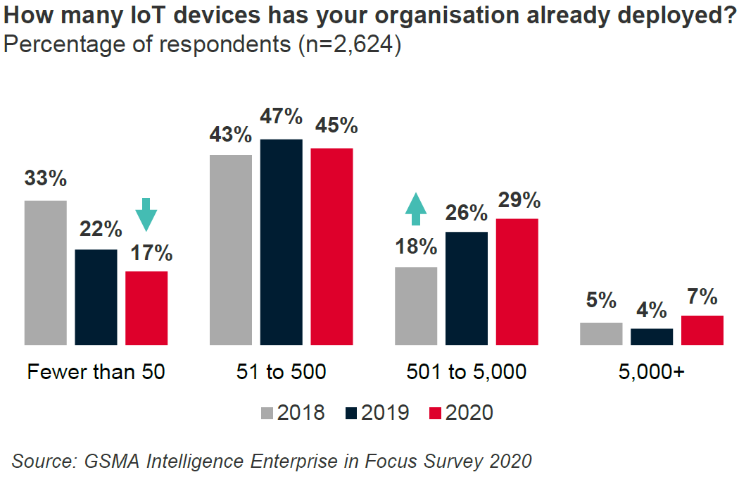 基于 GSMA 的调研,~45% 企业物联网设备数量在 51~500 个,~29% 企业的数量在 501~5,000 个。少部分企业会有 5,000 个以上终端数量。