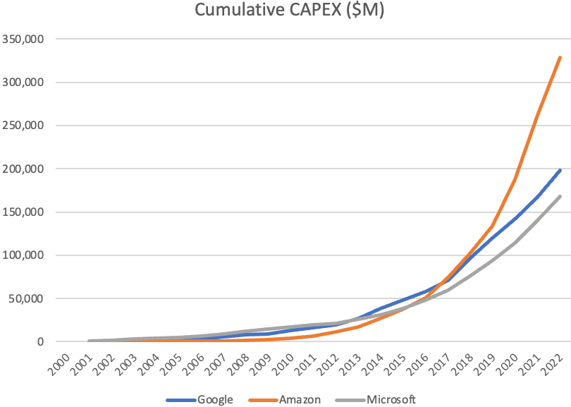 Platformonomics 统计了 Amazon, Google 和 Microsoft 三家巨头二十年来的 CAPEX 数据。三家公司一共在二十年来投入了 7,000 亿美元 CAPEX。