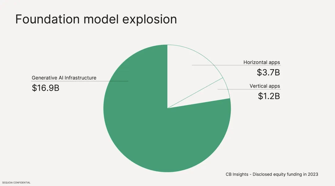 根据红杉资本的研究,其认为过一年一共有 500 亿美元花费在了生成式 AI 上面(包含数据中心配套的机房、供电等)。