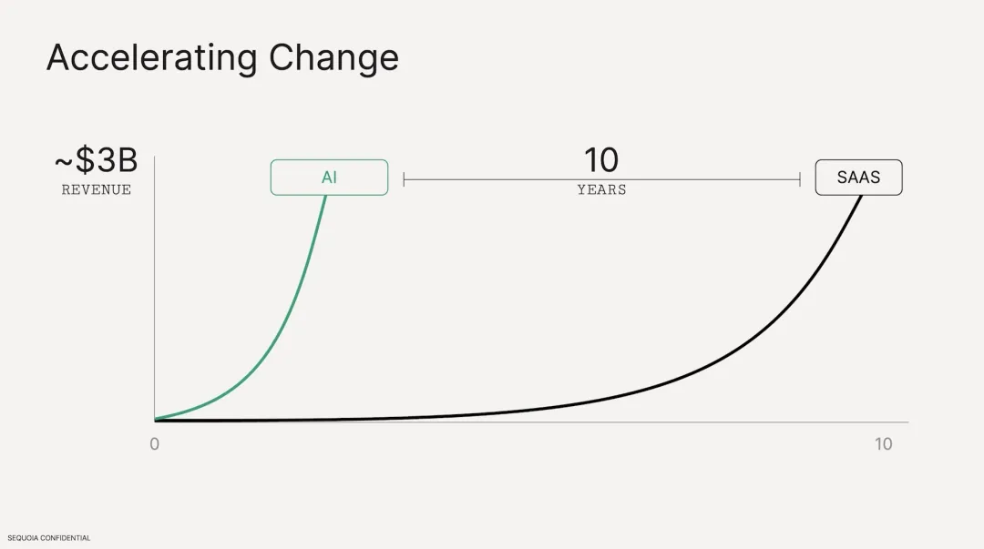 图 1:生成式 AI 目前达到了 30 亿美元的收入,大约花费了一年多时间。而 SaaS 达到类似水平花费了十年。
