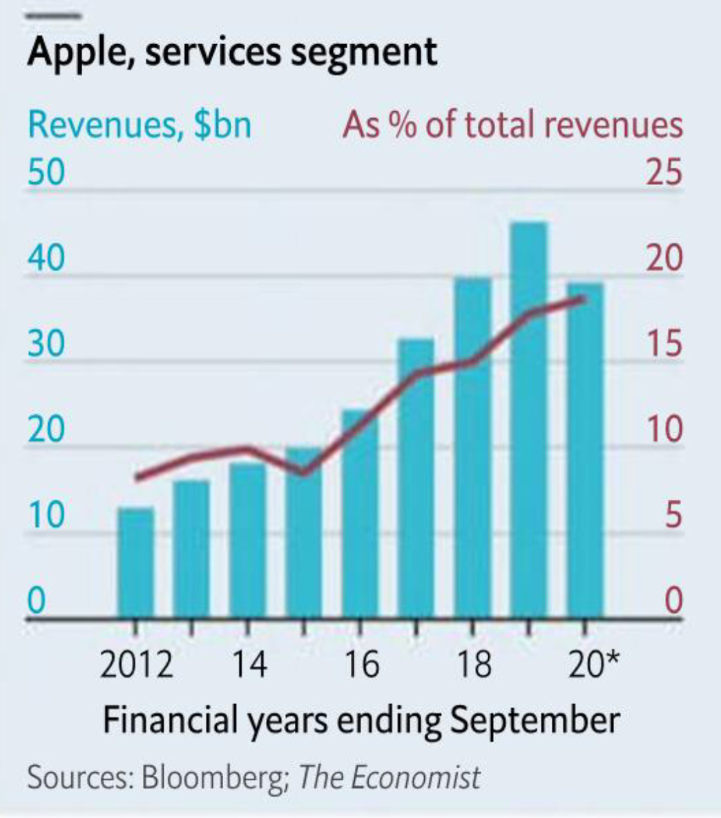 经济学人最近的数据展示,预计 Apple 近年服务类业务的收入贡献可以达到整体收入的 20%。对比而言,2012 年服务类收入占比仅为 10% 不到。
