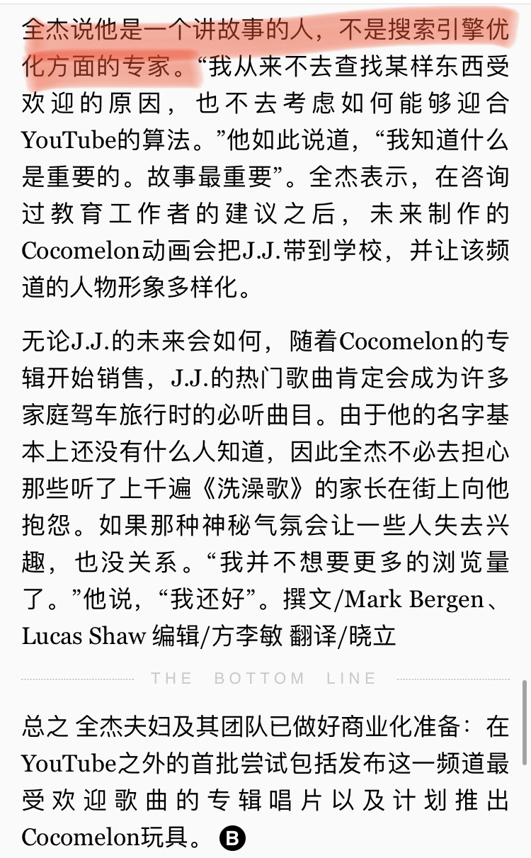 Cocomelon的成功让包括全杰在内的所有人都措手不及。十多年来,他和他的妻子或多或少都是在凭自己之力运营着这个频道,他喜欢这样的方式。