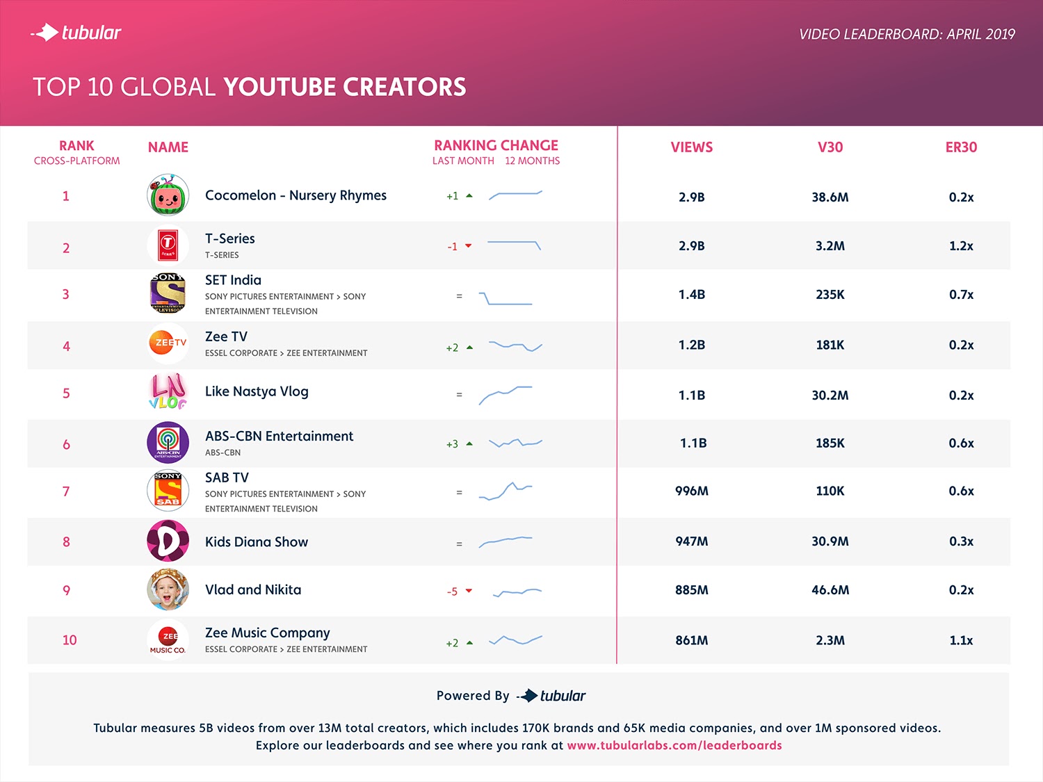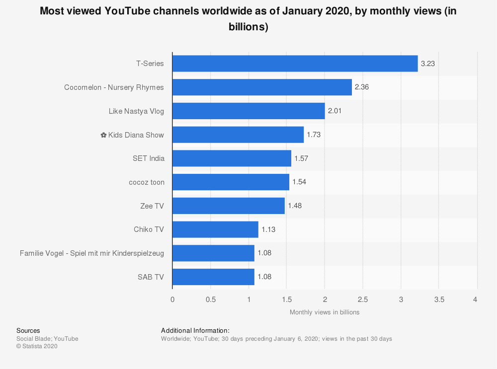 就浏览量而言,Cocomelon一个普通的视频让足以世界上大多数体育联盟、流行明星和脚本电视的收视率都相形见绌。它是YouTube上收视率第二高的频道,仅次于印度音乐之王T-Series。