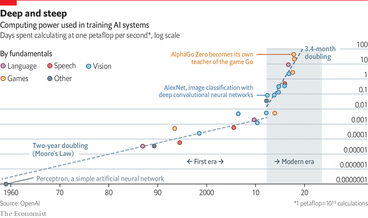 The Economist 基于 OpenAI 披露的数据,绘制了一张图,展示了不同的大模型及应用在算力需求上的变化。