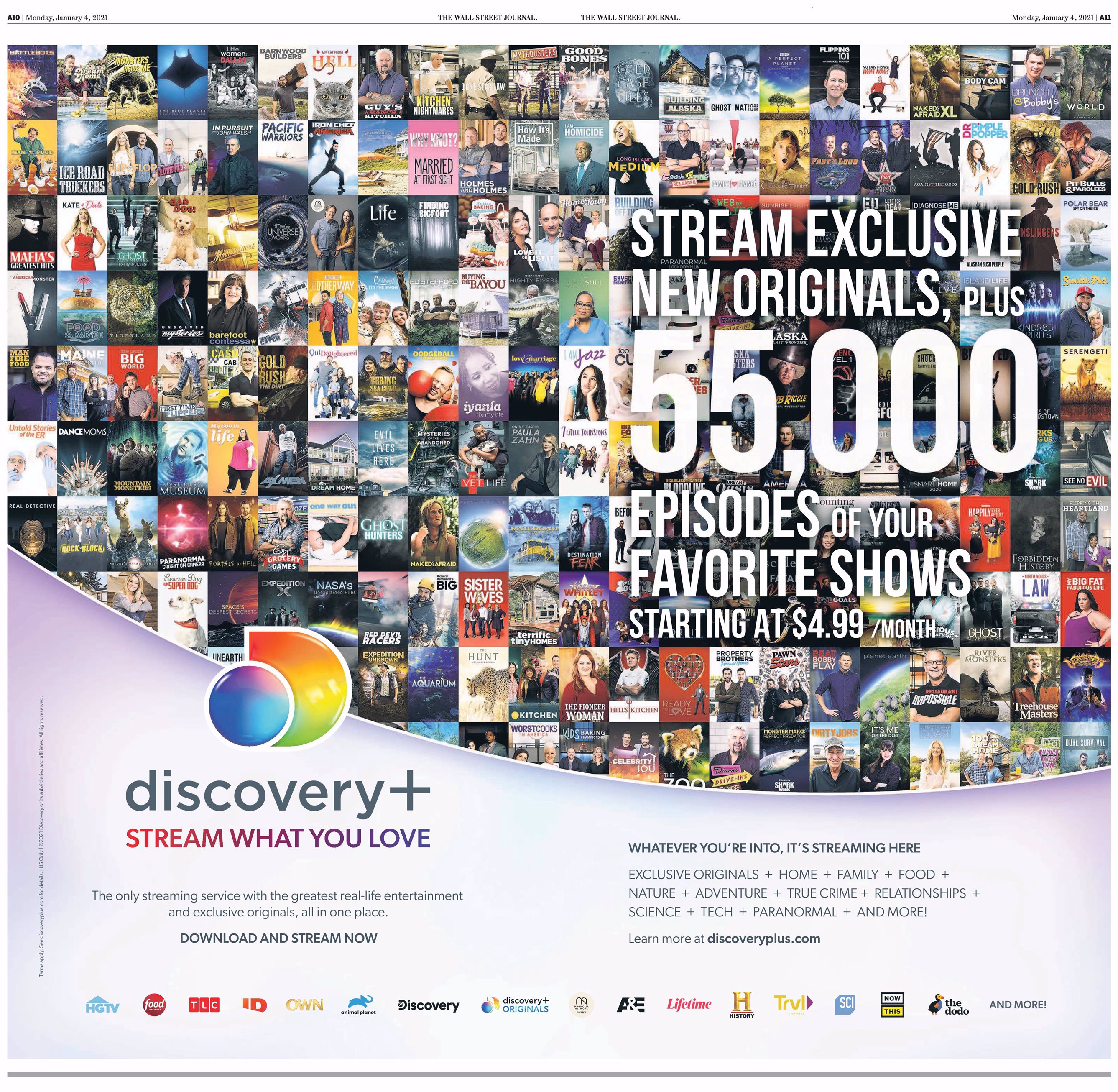 下图是 Discovery+ 在华尔街日报的最新广告,宣传 Discovery+ 包含旗下HGTV、Food Network 和动物星球等超过5.5万集的内容。