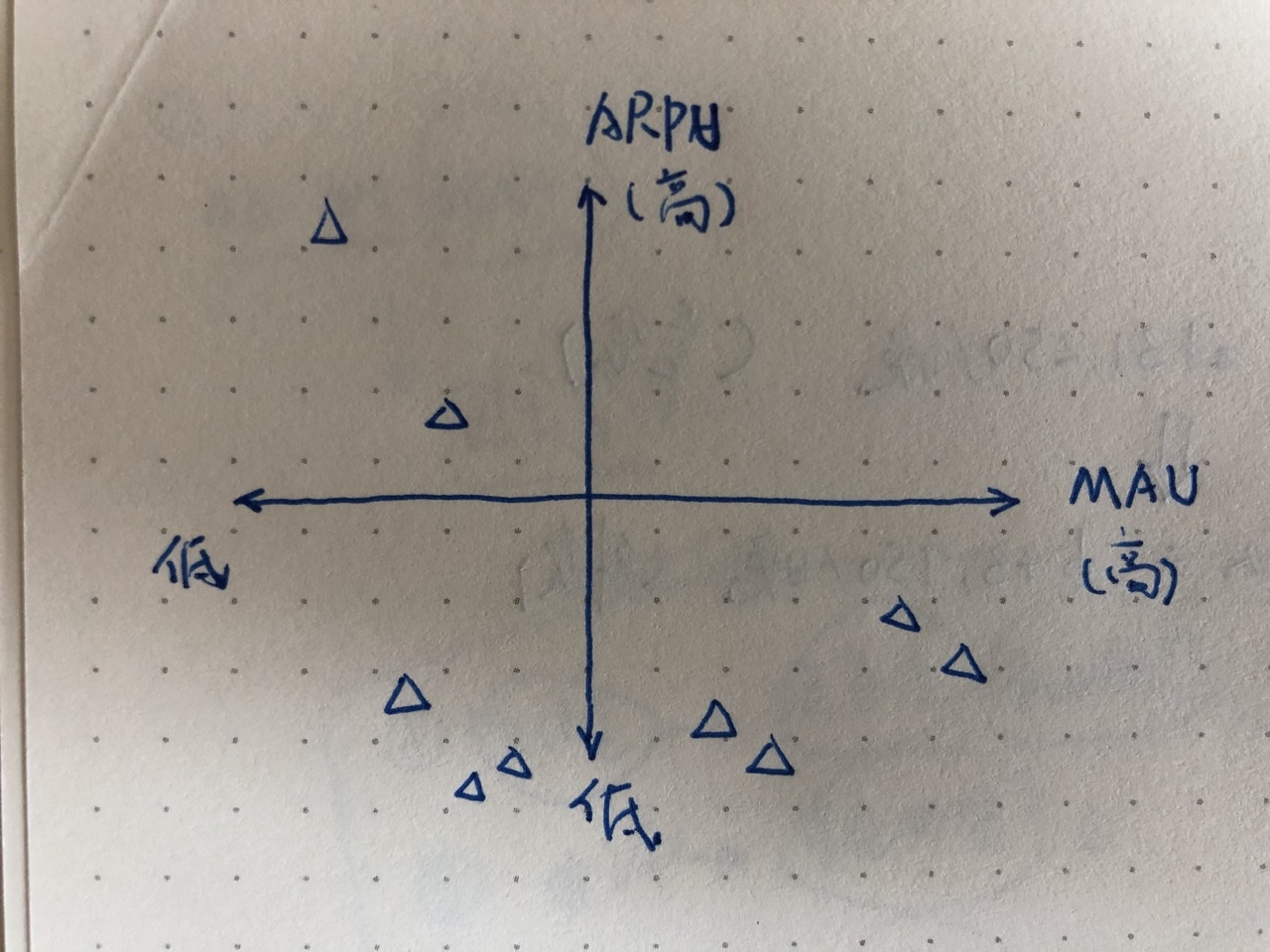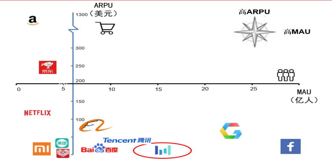 ARPU 与 MAU 作为两个维度绘制矩阵,就可以得到各大互联网公司主业务的收入定位。