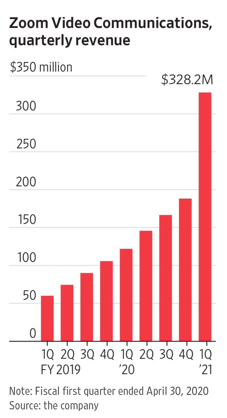 随新冠疫情和远程办公的兴起,ZOOM 收入大幅攀升,2020Q1 收入达到 $328M,比上季度涨了近一倍。预计 2020Q2 收入将达到 $495~500M。