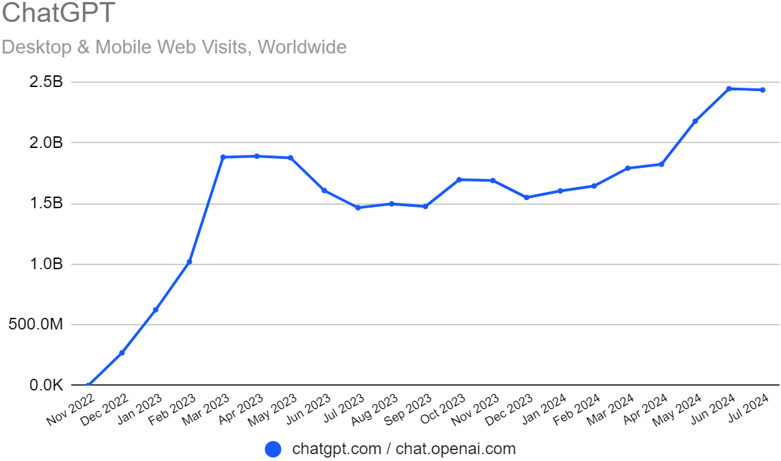 Similarweb 的监测数据显示,ChatGPT 在 2024 年 6 - 7 月的月度访问量接近 25 亿次,对比 2023 年的第一波高点(< 20 亿次)提升了 25% 左右。