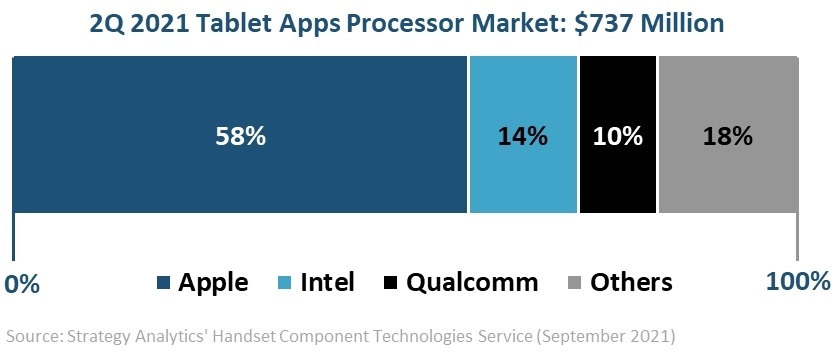 基于 Strategy Analytics 咨询公司的研究,2021Q2 全球平板电脑处理器市场空间为 7.37 亿美元,Apple 占据了 58% 的份额,Intel 为 14%。