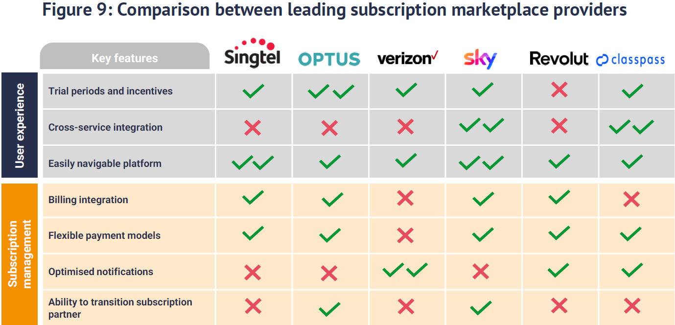 代表性国际电信运营商在 Marketplace 订阅服务的能力对比