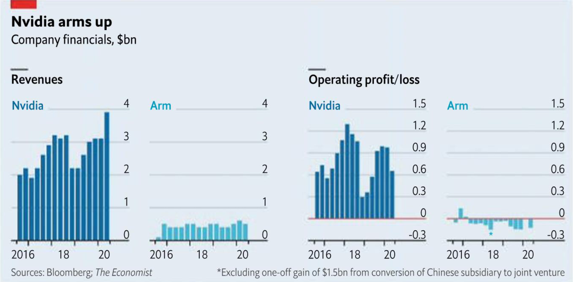 Nvidia 向 ARM 发出收购要约,经济学人的一张图对比了两家公司营收和利润情况。