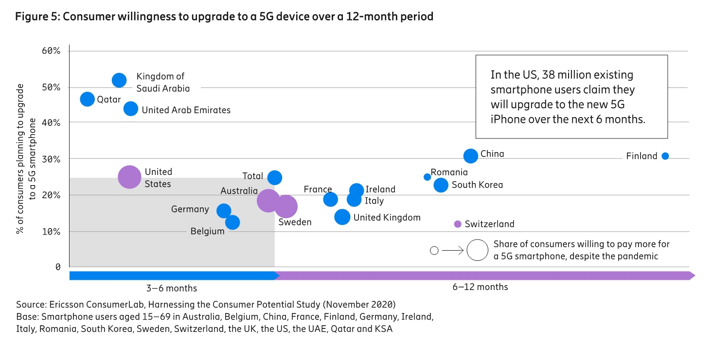 5G 版的 iPhone 对于市场影响很大。以美国为例,有 3,800 万用户在 iPhone 5G 发布后的 6 个月内选择升级。