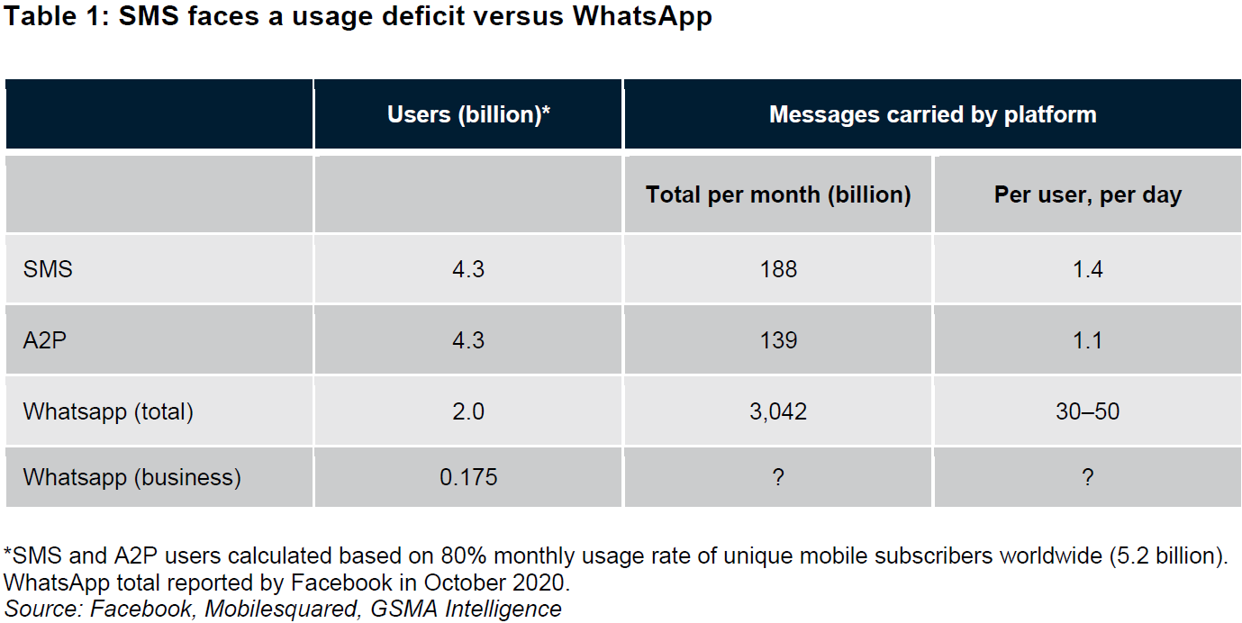 GSMA 的一项研究,估算了全球短信的业务量,并和 Facebook 旗下 WhatsApp 进行了比较。