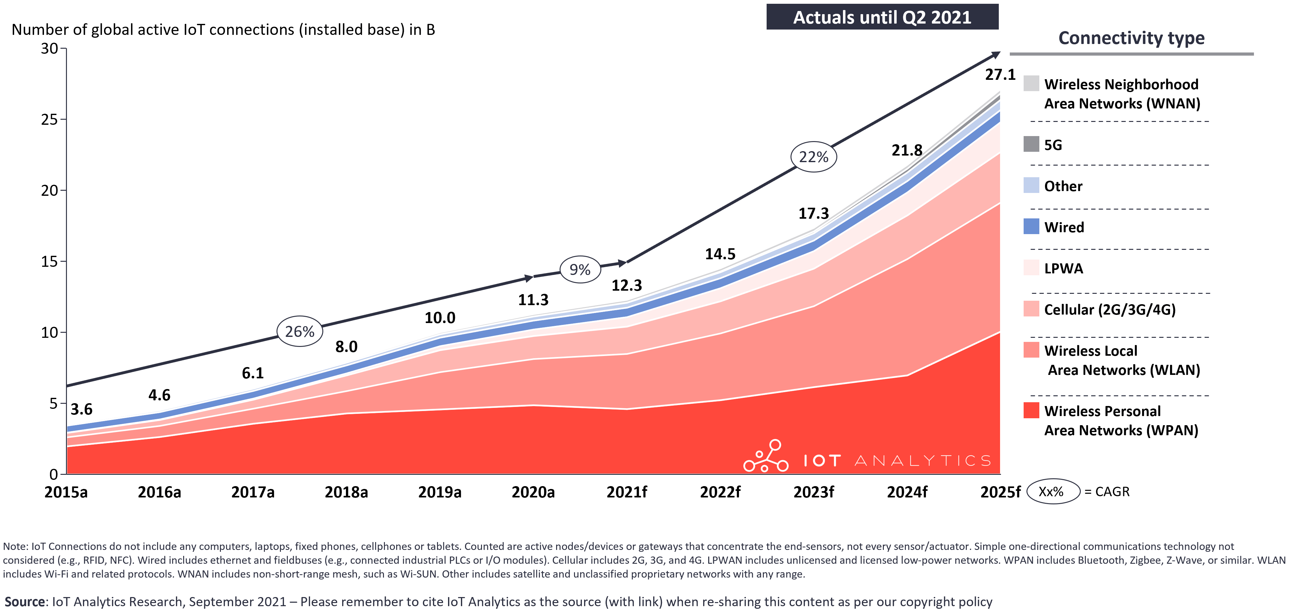 IoT Analytics 咨询公司 2021Q2 的预测,围绕全球广义物联网连接数的走势判断。
