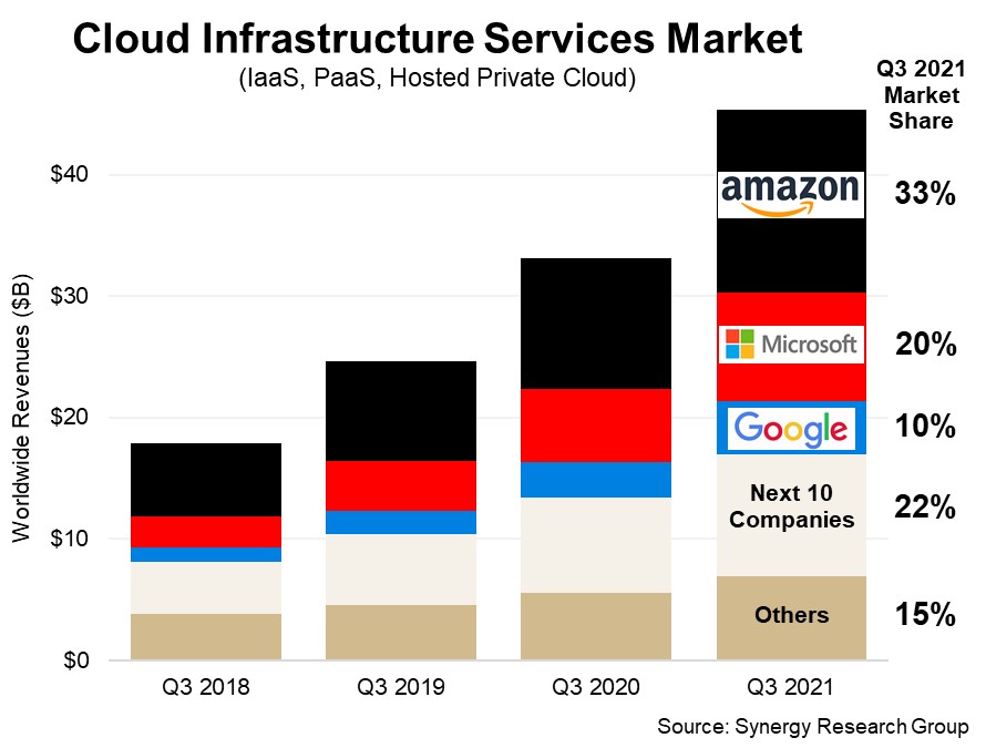 根据 Synergy Research 的研究,以 2021Q3 为例,整体收入增长同比 2020Q3 为 37%。Amazon、Microsoft 和 Google 虽然继续取得了巨大的增长,但其他玩家也取得了 27% 的同比增长。