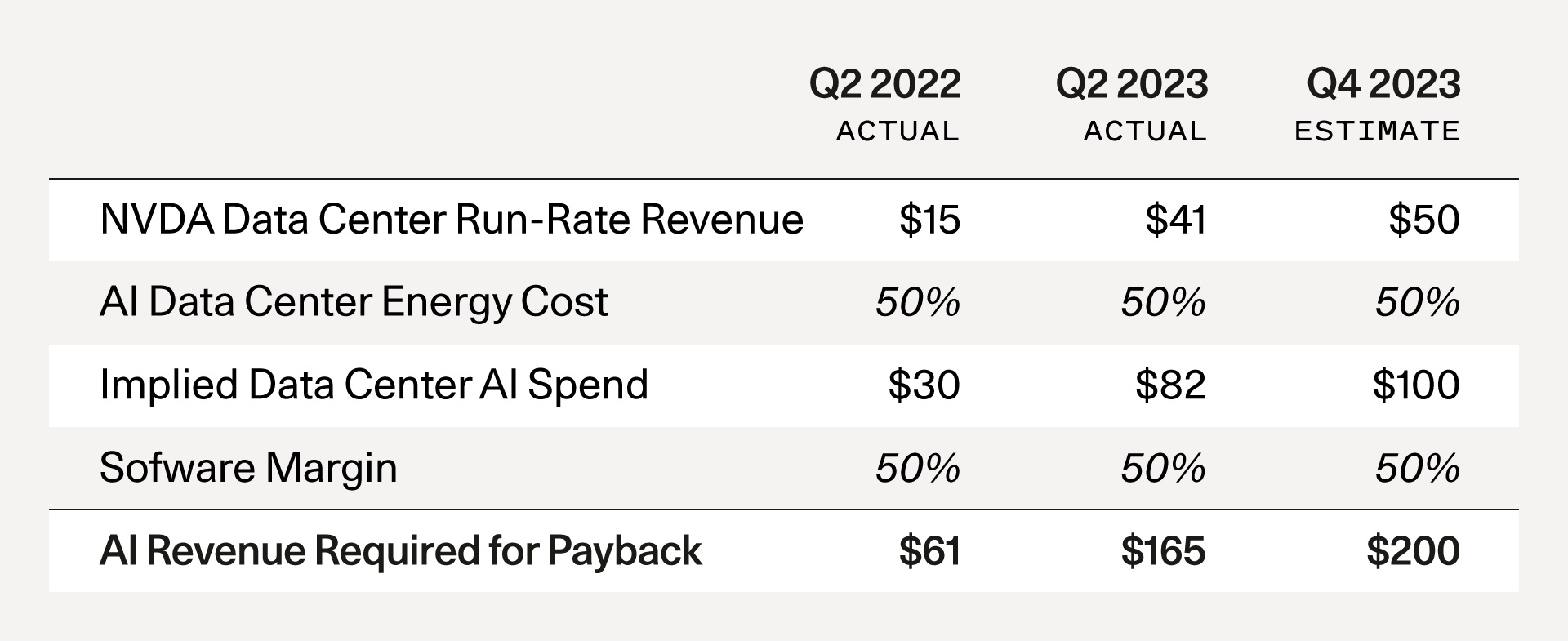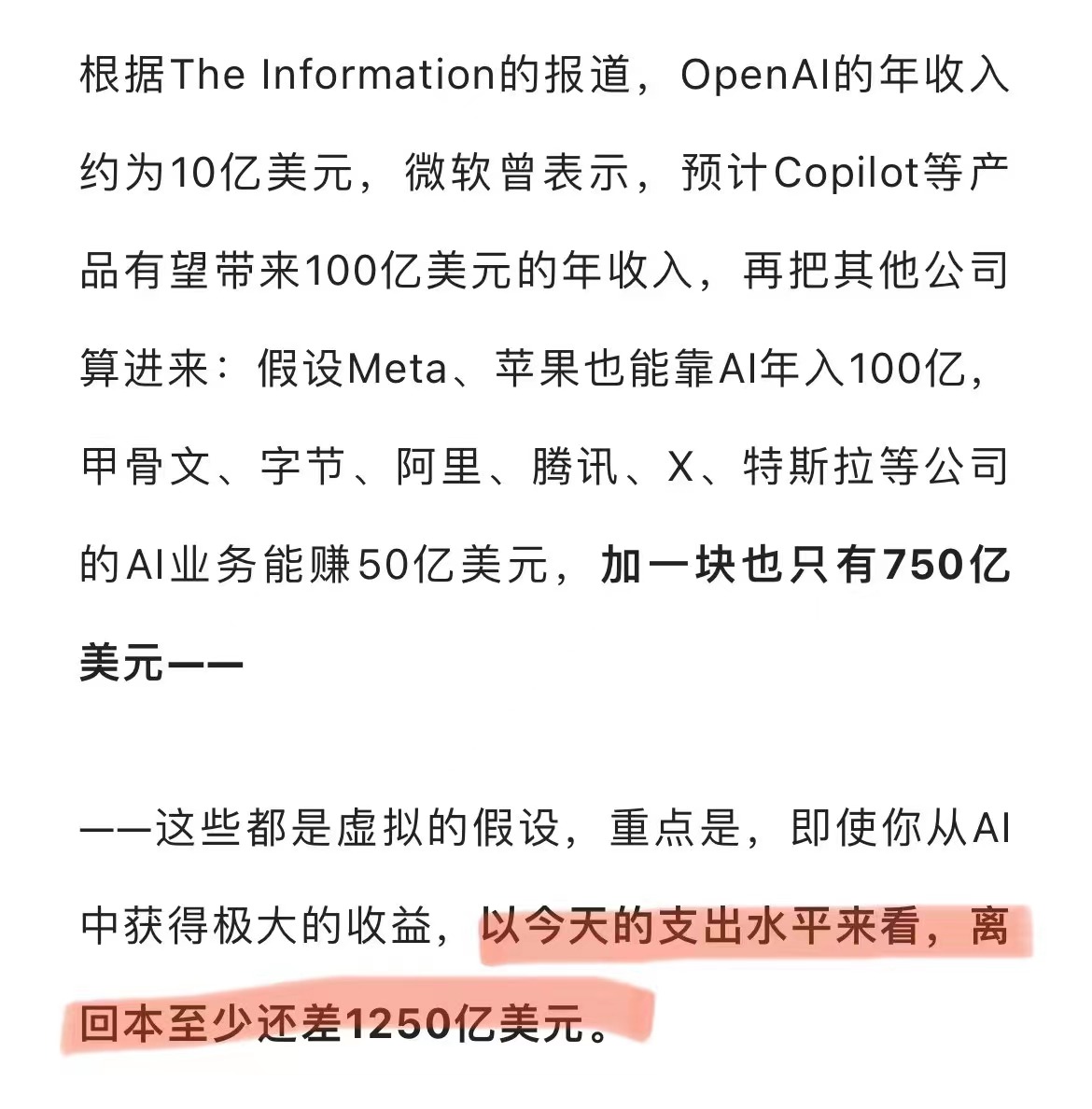 红杉资本 David Cahn 提出一个 “AI’s $200B Question 人工智能的 2000 亿美元的问题”,即谁在为英伟达的客户再买单
