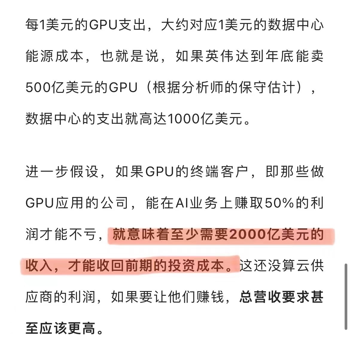 ⑴ 国际市场:基于 GPU 的公司,至少需要新赚 2000 亿,才有能力购买英伟达 500 亿美元的 GPU;