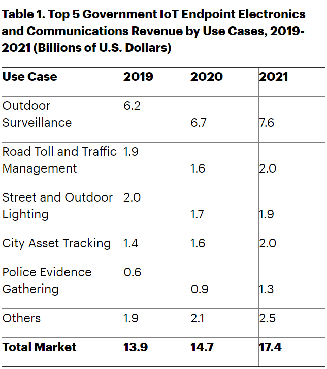 2020 年政府物联网市场最大的机会:户外监控、街道和户外照明、以及道路收费和交通管理。