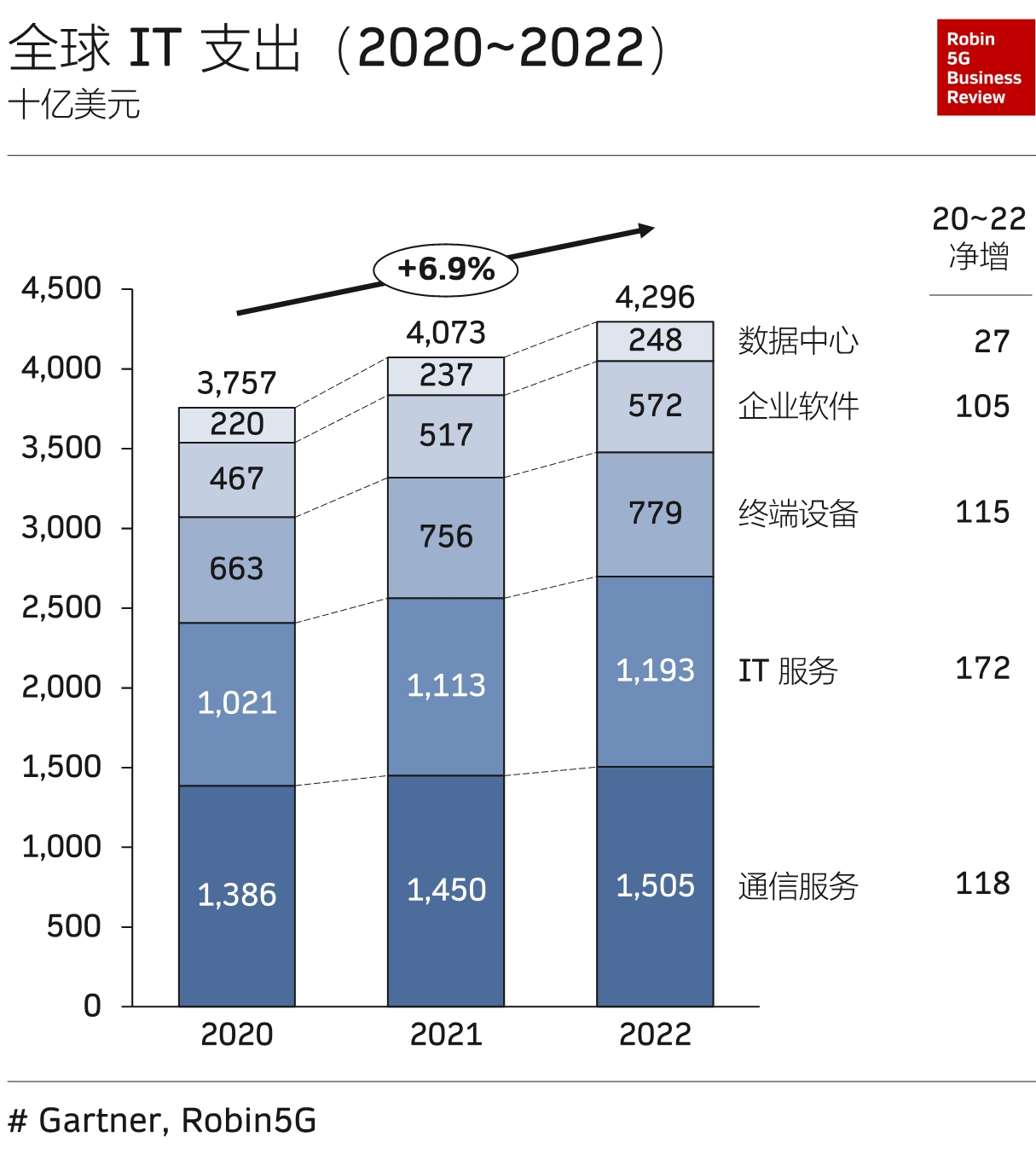 我们做了一个 2020~2022 年净增量的分析,企业软件、终端设备、IT 服务和通信服务四大类别基本净增都在百亿美金以上,可认为是同一数量级。