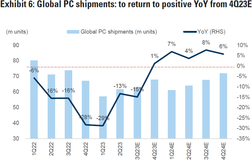 高盛认为 2023年Q4 开始,全球 PC 出货量有望重新开始启动增长爬坡过程。