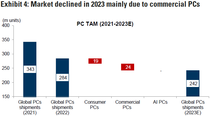 下滑的原因一部分是因为疫情期间被刺激的 PC 消费的很大的一个基数,另一方面可能也有全球经济放缓和通胀等原因。