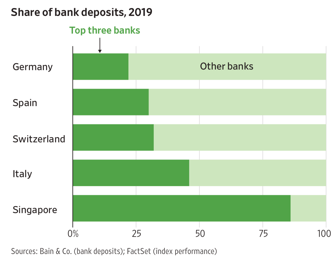 看到一张图,德国、西班牙、瑞士、意大利和新加坡 Top 3 商业银行占据的存款份额对比。