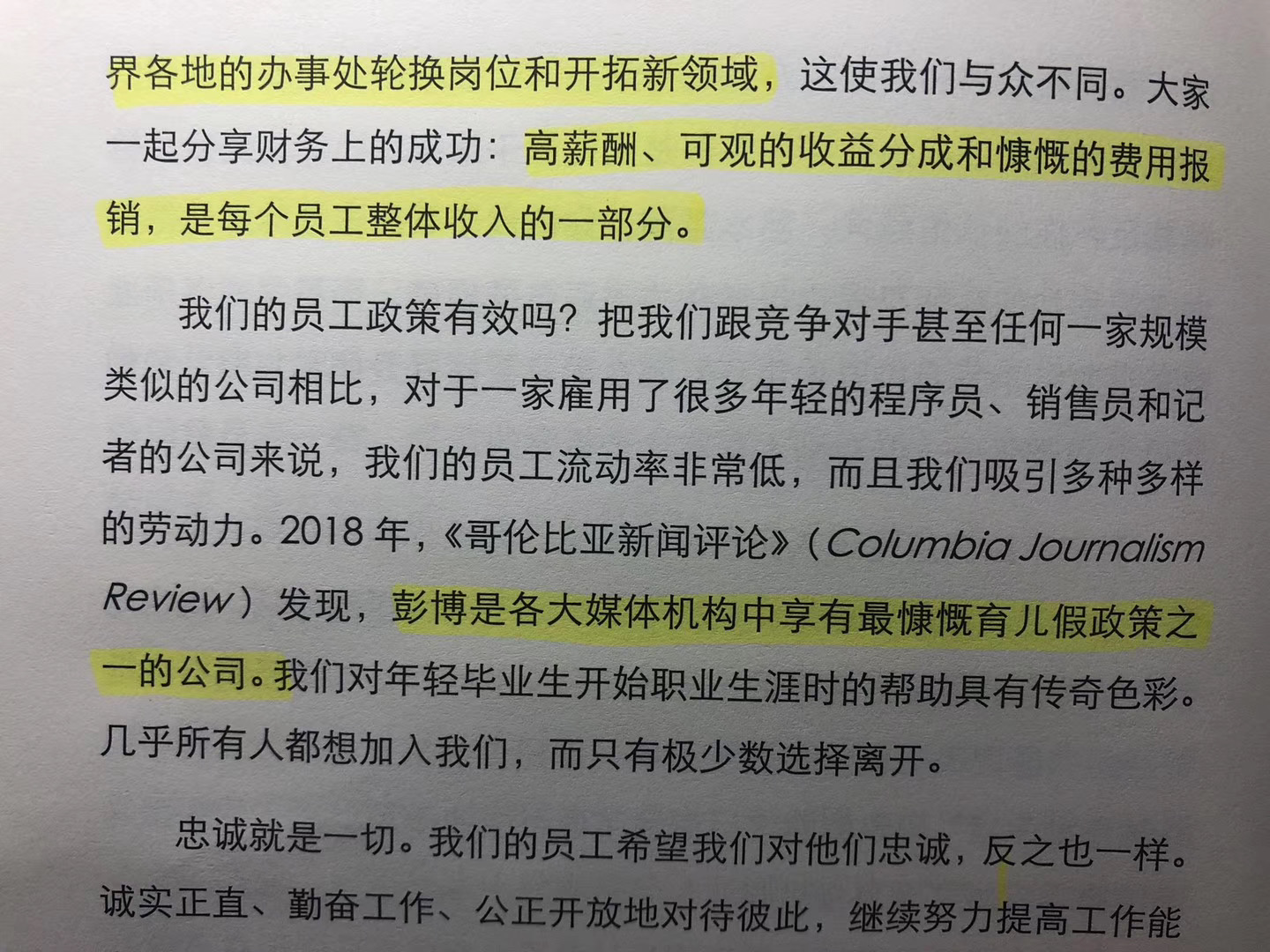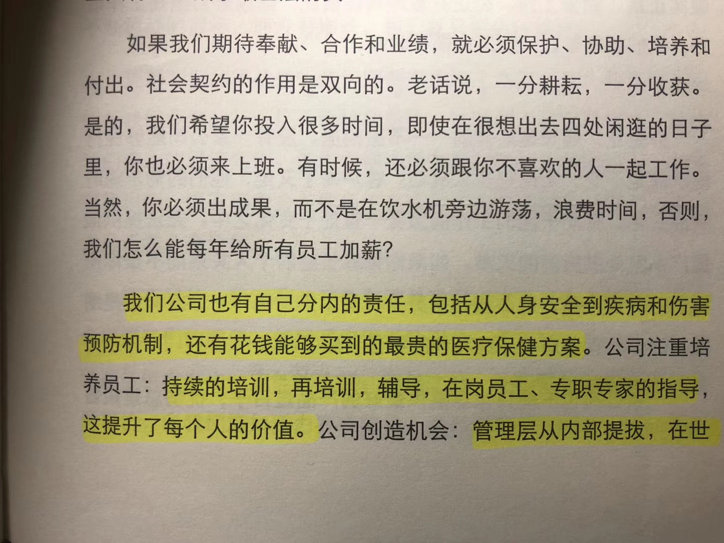⑺ 公司和员工双向契约精神;对员工要求严格,同时公司份内的责任做好:最贵的医疗保险、高薪、慷慨的费用报销、育儿等福利;