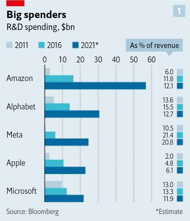 附图展示了 Amazon、Alphabet (Google)、Meta(Facebook)、Apple 和 Microsoft 五大科技公司从 2011~2021 的研发投入变化。