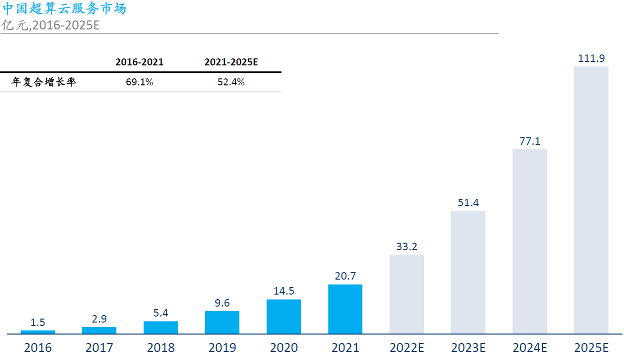 Frost & Sullivan 估计 2021 年中国超算云服务仅有 20 亿元,还处于较小规模;但增长很快,预计到 2025 年会达到 112 亿元。
