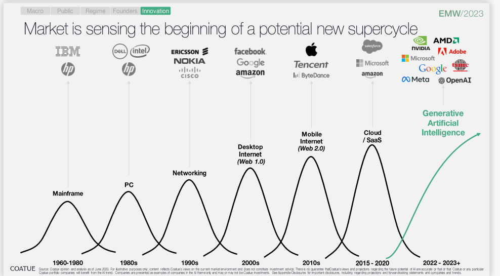 围绕生成式 AI 的机会,Coatue 罗列了很多,既有大模型 GPT 和杀手级应用 ChatGPT 的服务商 OpenAI,也有 GPU 算力芯片服务商 nVidia 和 AMD,还有台积电 TSMC,还有利用 AGI 强化当前服务的 Adobe。
