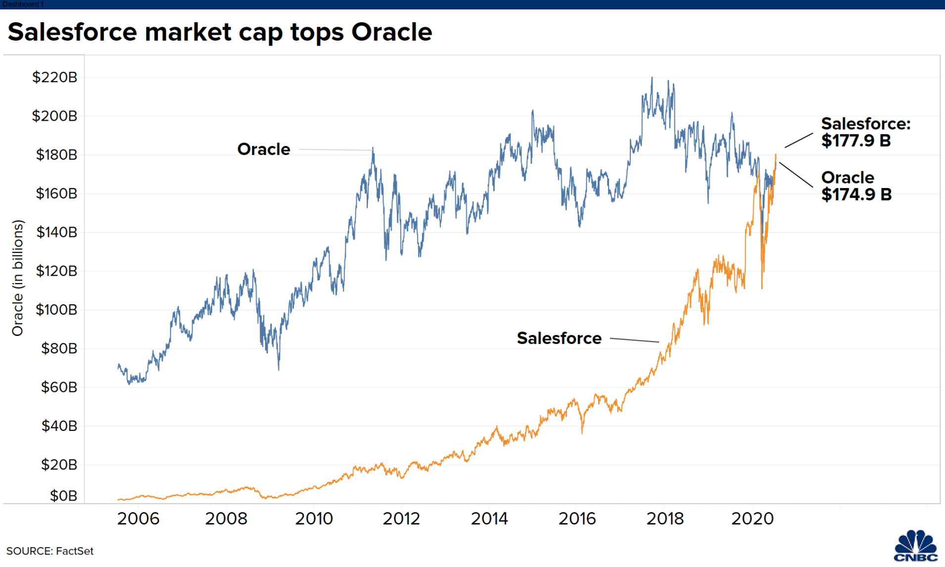 于是 Marc Benioff 离开服务了 13 年的 Oracle,于 1999 年创立了 Salesforce。前两天 Saleforce 公司市值首次超越 Oracle,堪称里程碑式的事件。
