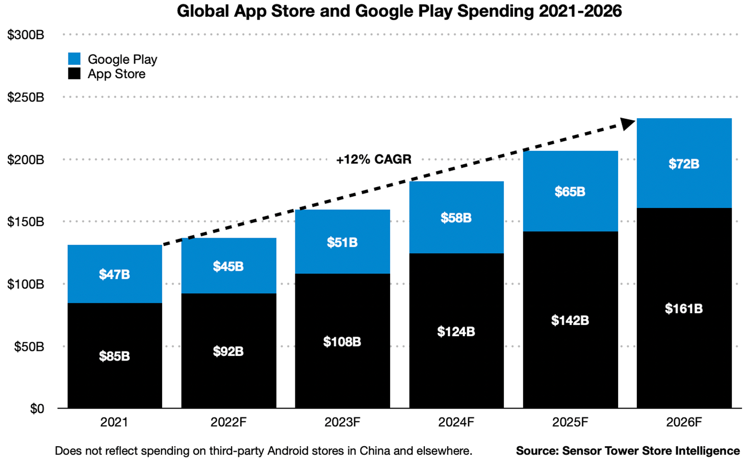 Sensor Tower 估计 2021 年,消费者在 AppStore 开支为 850 亿美元,在 Google Play 的开支为 470 亿美元。预计到 2026 年,前者开支会达到 1610 亿美元,而后者也会达到 720 亿美元。