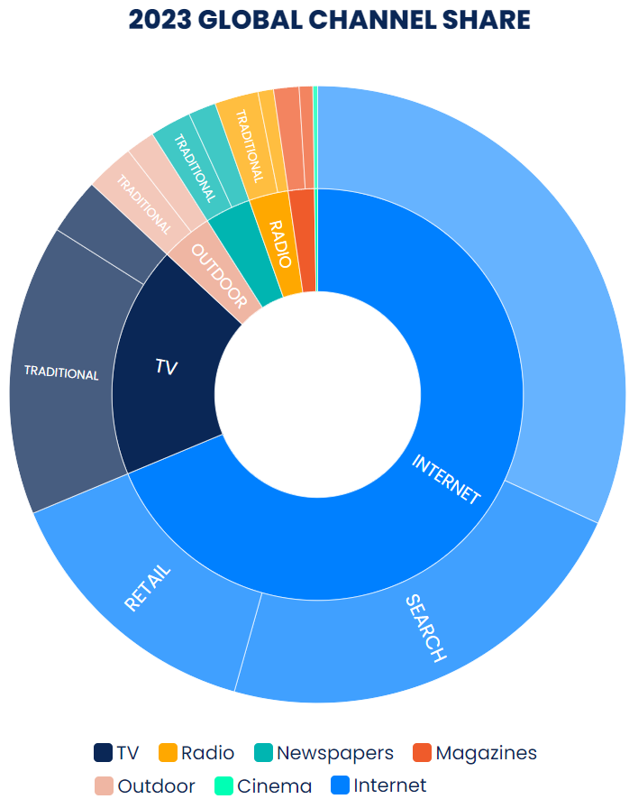 附图是广告收入按媒介渠道的构成比例。互联网广告占了大头,收入空间为 6,017 亿美元;电视是第二大媒介渠道,收入空间为 1,595 亿美元。