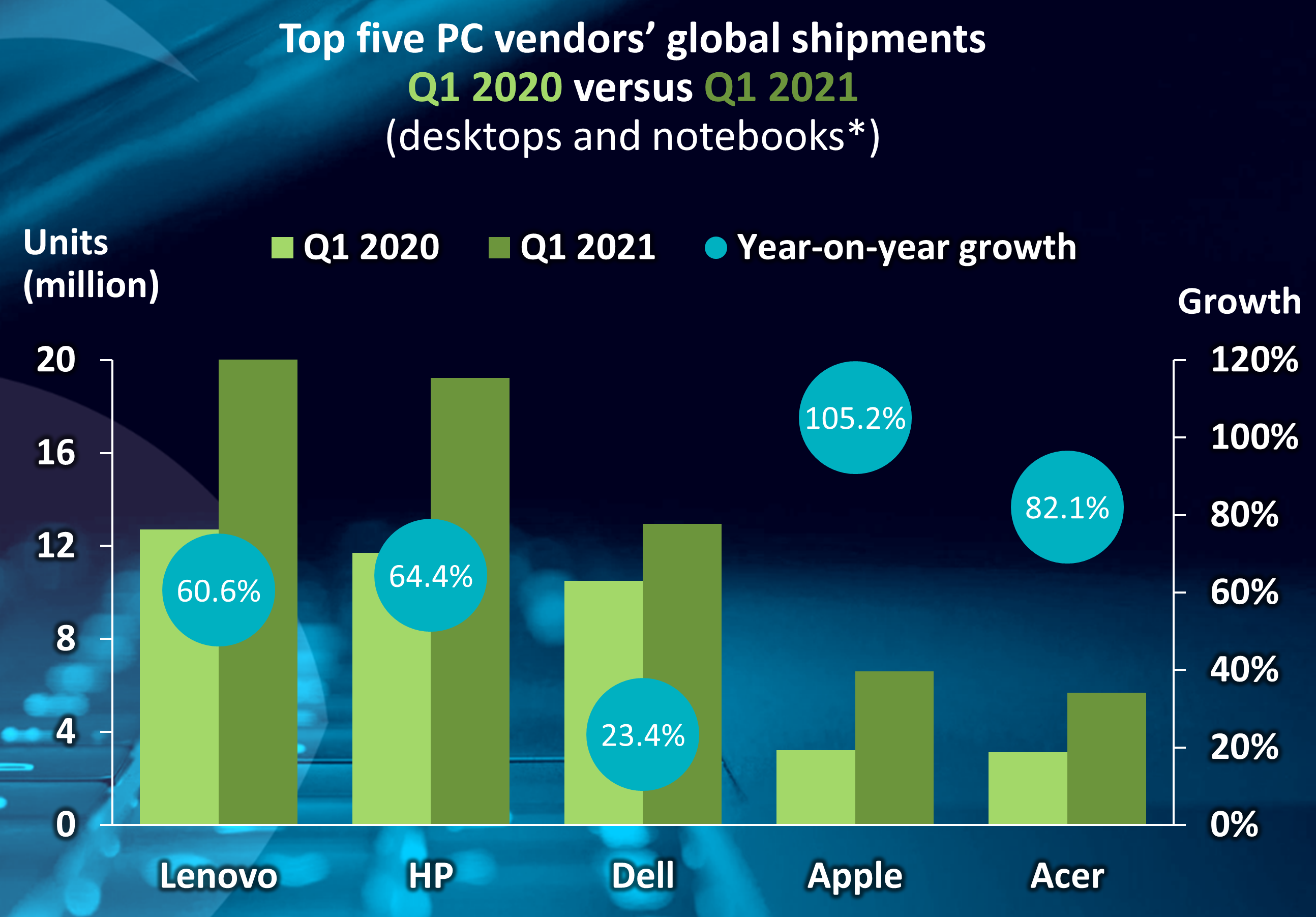 投资银行 Bernstein 汇总了 IDC 和 Gartner 围绕全球 PC 出货量的多年数据,尤其是对比历年 Q1-Q2 的环比增幅。
