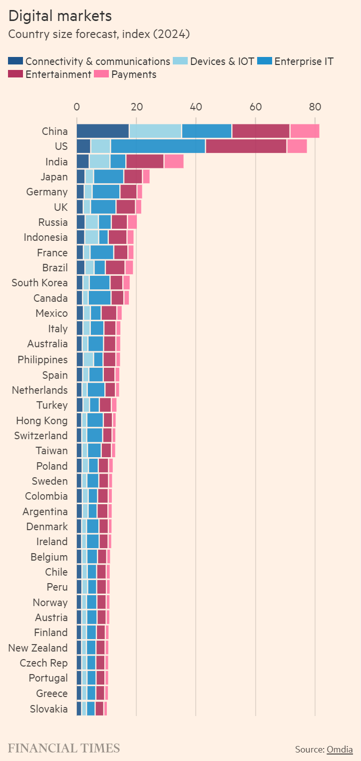 金融时报和 OMDIA 的联合研究 FT-Omdia Digital Economies Index(数字经济指数)显示,中国大陆的数字经济规模将在 2022 年首次超过美国,成为全球最大的数字经济体。附图是 2024 年的预测。