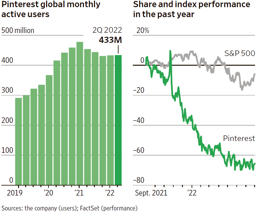 另一家北美热门的图片社交公司 Pinterest,也面临类似的问题。附图分别是其股价和活跃用户的曲线。